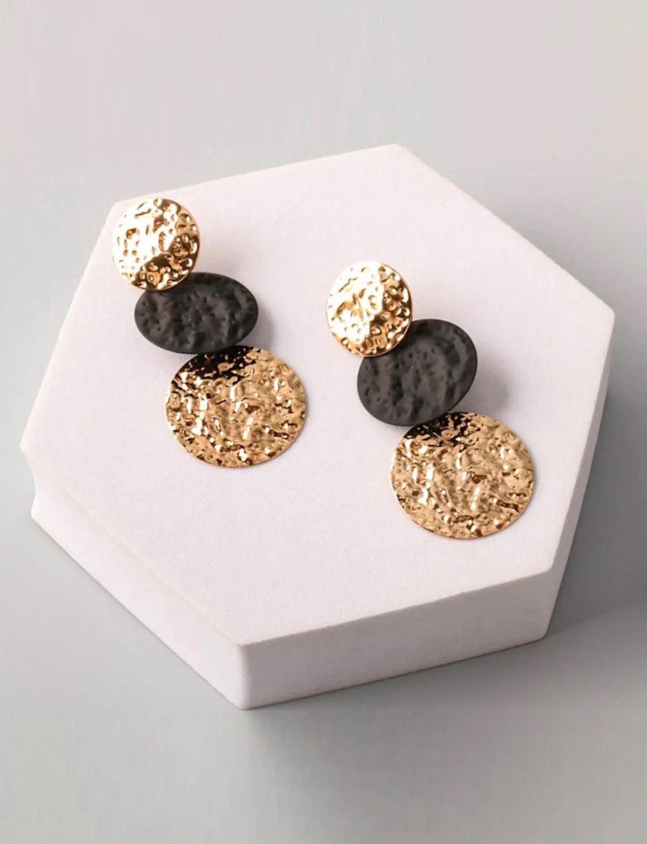 Dual-tone gold and silver finish, lightweight hanging silhouette, hypoallergenic plating, easy-to-style with multiple outfits.