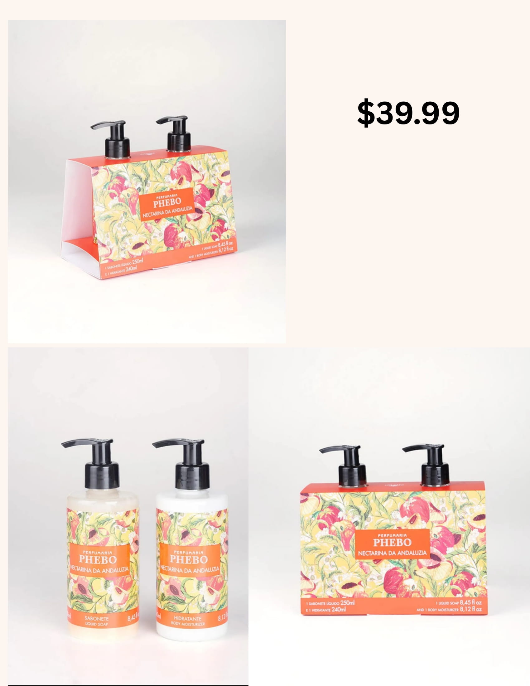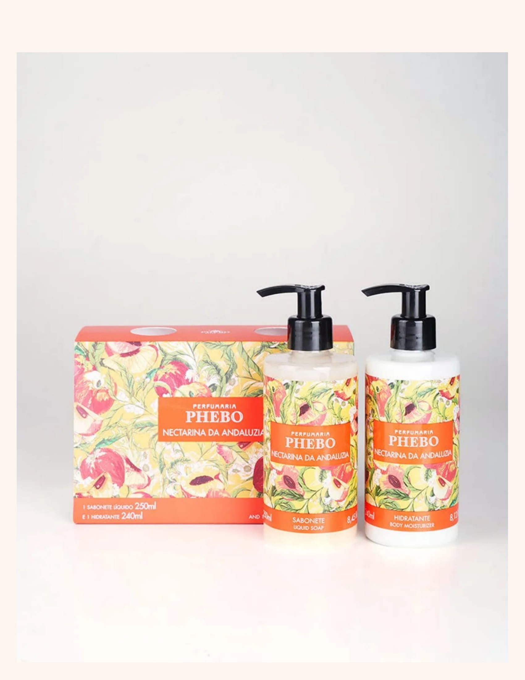 Double with creamy soap and moisturizer ideal for gifting! Andalusian Nectarine is perfect for those who love a fruity, juicy, vibrant, green fragrance. Free of parabens, dyes and ingredients of animal origin. Content: Liquid soap 250ml and moisturizer 240ml